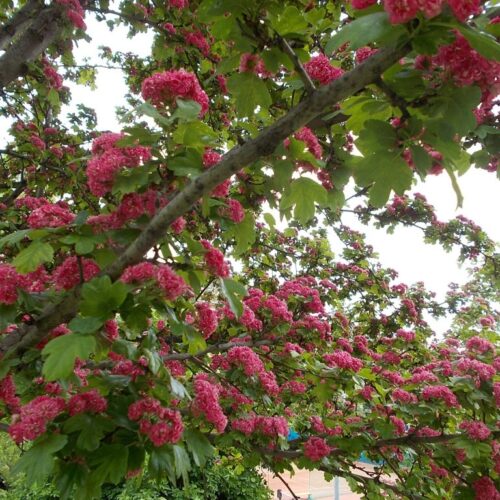 The purple-leafed plum tree is one of the first cherries to flower on the spring with a pink flower. The leaves are bronze in colour at first, gradually darkening to rich purple later in the season. It grows to about 15 ft in height and a 10 ft spread.